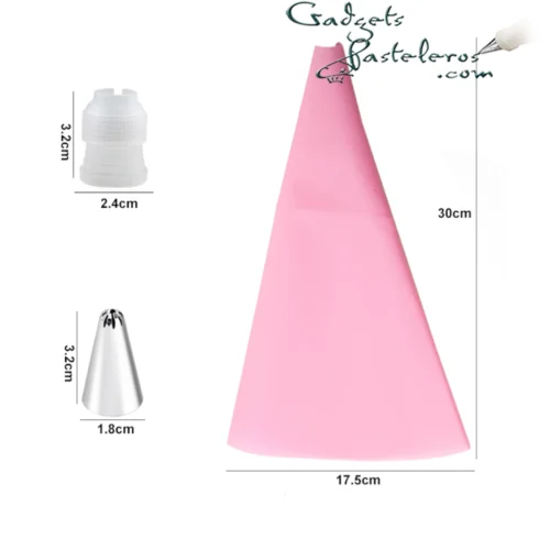 El set incluye 12 boquillas pequeñas, 1 acople pequeño y 1 manga pastelera en silicona pequeña