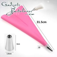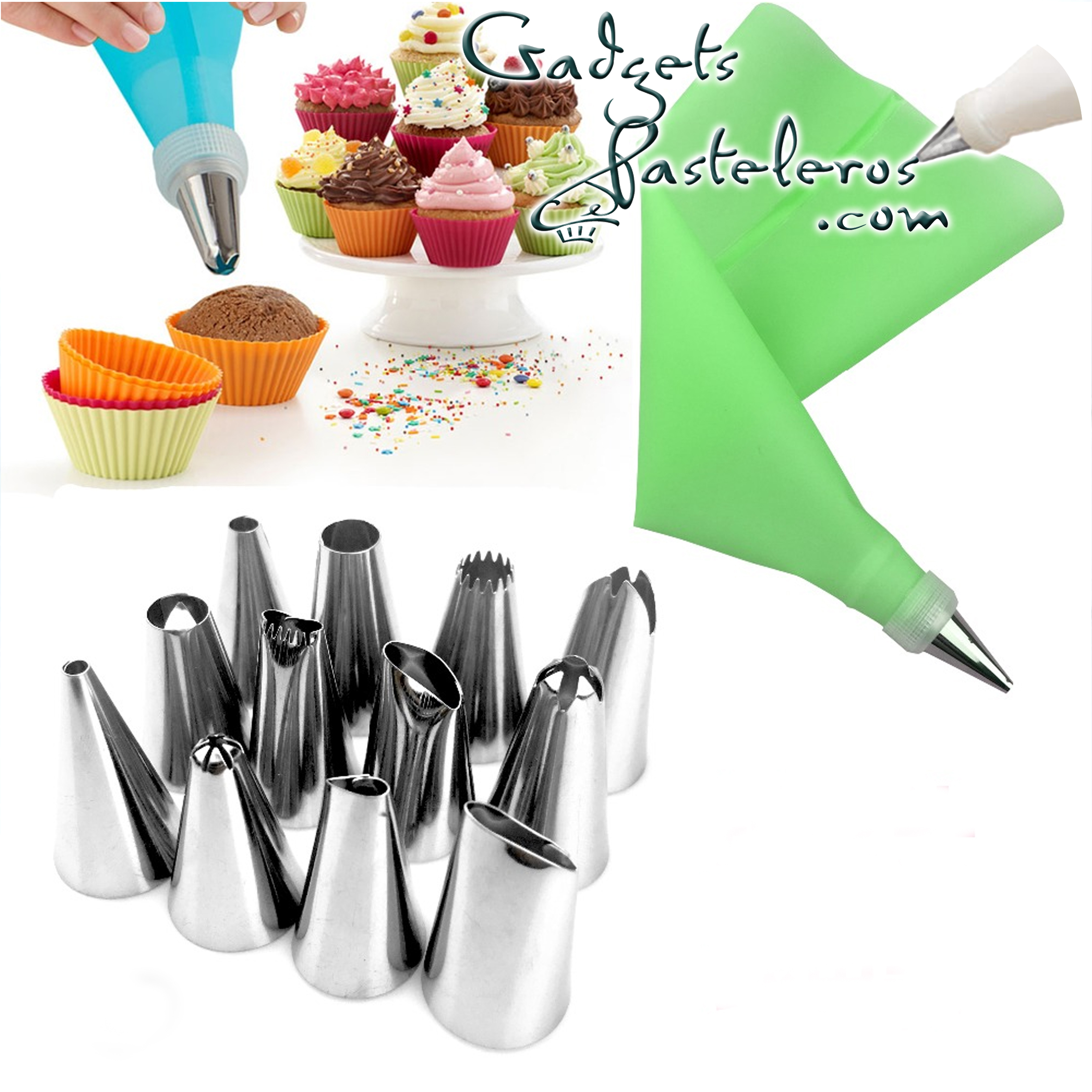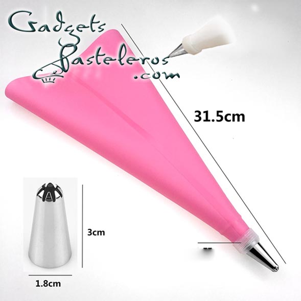 El set incluye 12 boquillas pequeñas, 1 acople pequeño y 1 manga pastelera en silicona pequeña